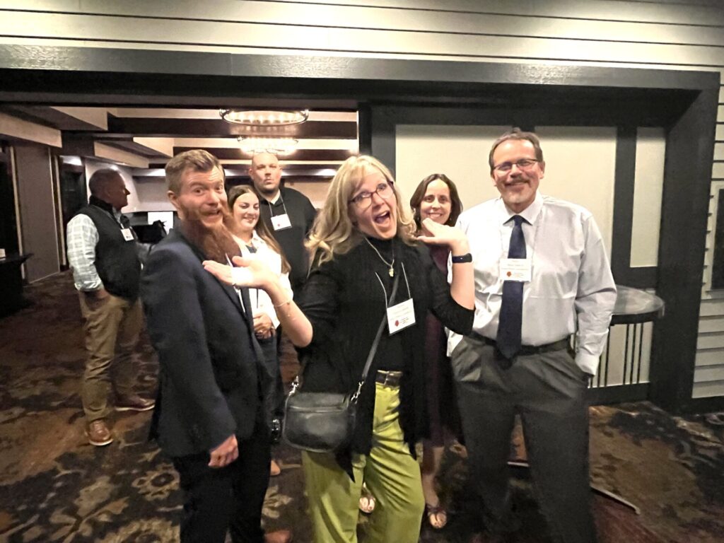 Photo 1: Retail Customer Service Award Winner Erik Duemmler (right)(George Lumber) pictured with Sydney Olp (left) (North Counties Supply). Photo 2: Sky Sands, entertainer, having fun with members after dinner. Photo 3: Attendees having some fun.