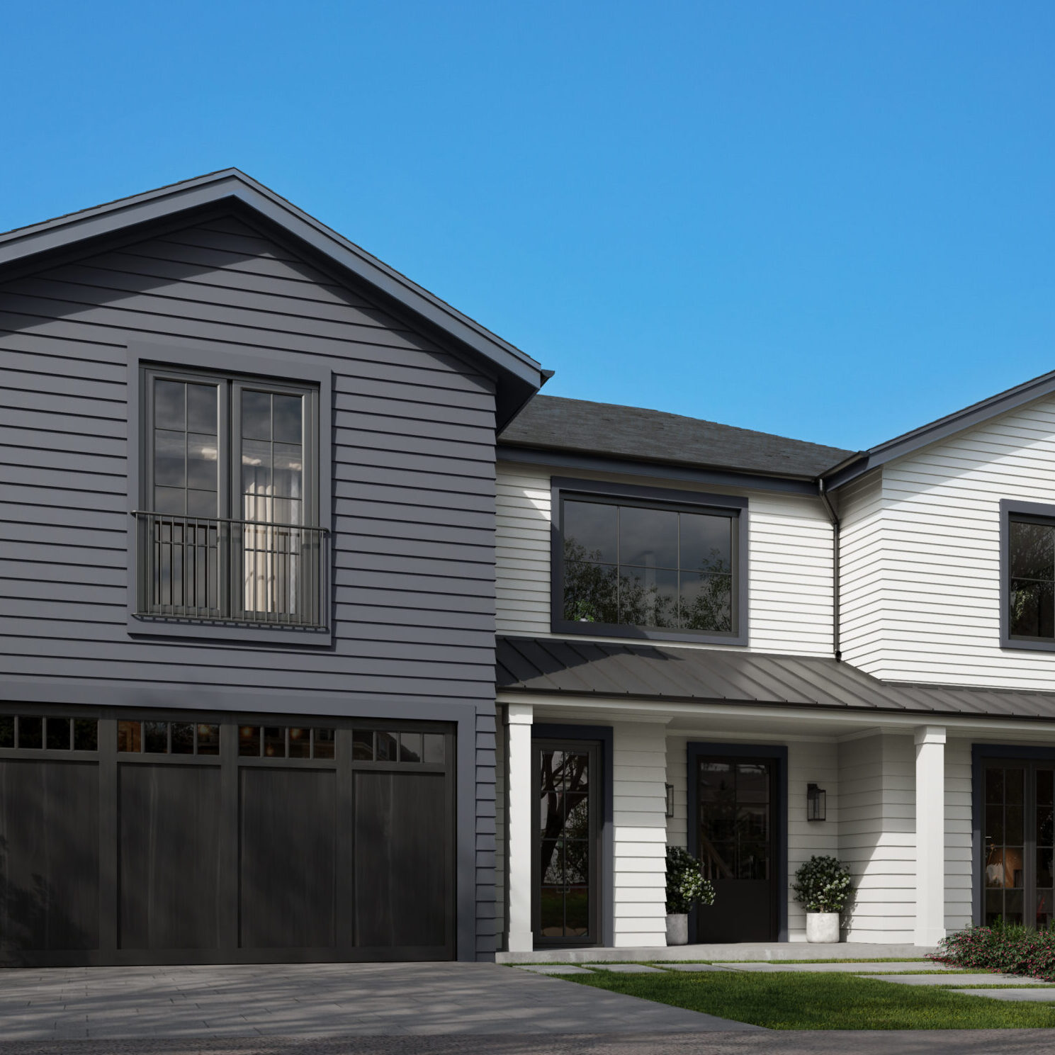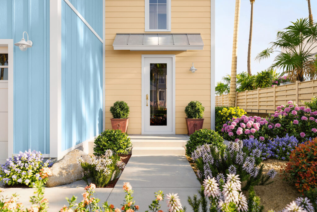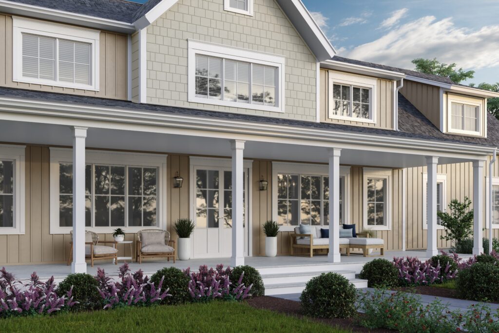 Color Drenching: A single hue used across siding, trim, stone and roofing creates a bold, cohesive exterior that is intentional and expressive.