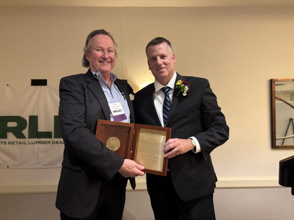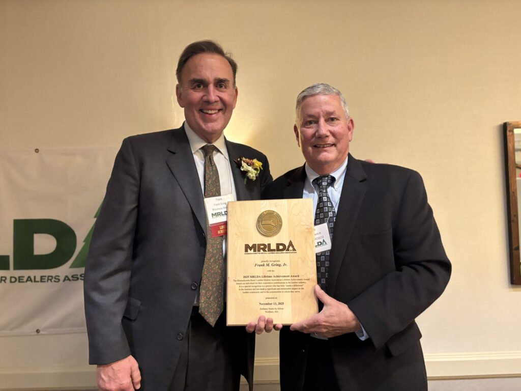 The Massachusetts Retail Lumber Dealers Association (MRLDA) celebrated its 126th annual meeting on Thursday, November 13, 2025, at the Embassy Suites by Hilton in Waltham, Mass. At this event, Kevin Brockmyre of Hood Distribution was honored as the Lumber Person of the Year and Frank Gring, retired of BROSCO received a Lifetime Achievement Award. Both gentlemen were celebrated for their distinguished careers, tireless dedication to promoting the industry and the MRLDA, and impactful community involvement.