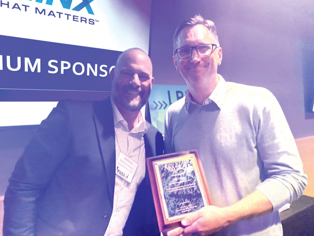 Photo 1: NYLILA President Anthony Capuano (right)(REEB Millwork) presenting Mike Bindler (East Islip Lumber, TSG) with the NYLILA 2025 Lumber Person of the Year award. Photo 2: The Bindler family. Photo 3: East Eslip folks.
